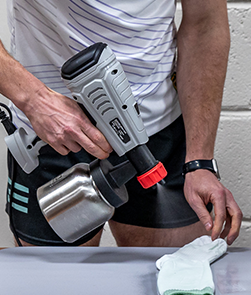 Qilta has researched and developed our Formula to a specific viscosity so that it can be sprayed onto our garments. This is particularly difficult to achieve in delivering an emulsifying formula. Qilta has developed high speed application methods for both Teams